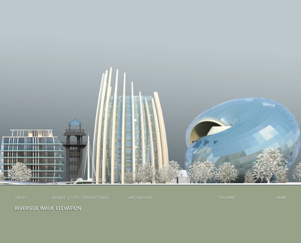 Project for a development of a long abandoned Market site in Taunton, includung theatre, retail, residential and waterfront leisure and restaurants. Project designed in collaboration with Niki Denning at Denning Architects Taunton.